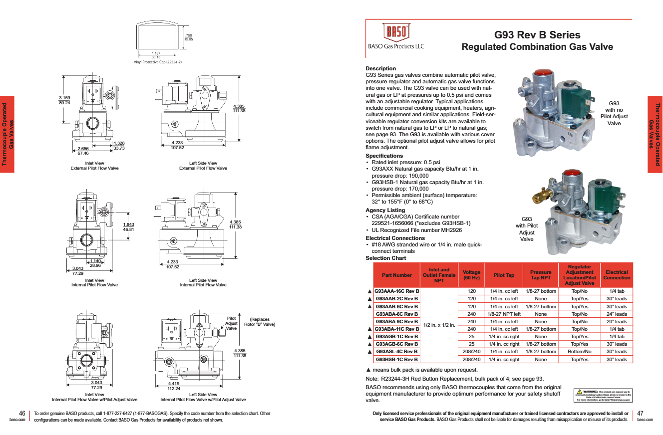 The BASO G93ABA-11CREVB is a 1/2" combination automatic gas valve designed for use in commercial and industrial gas-fired equipment such as boilers, furnaces, and ovens. Operating at 240V AC, it is capable of handling gas flow rates up to 200,000 BTU/hr, making it suitable for high-demand applications.