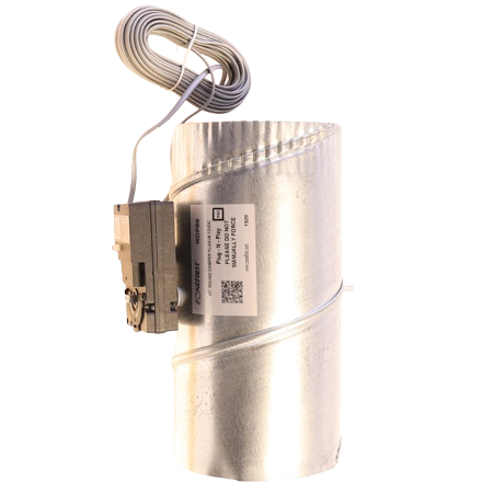 The RDP series round damper features a single-blade damper within a round spiral duct, equipped with a motor. The unit is designed for use with plug-in zoning panels with high-pressure or high-velocity systems exceeding 0.5" S.P. The MP12M plug-in damper motor and PIW25 modular cord replacement parts are also available.